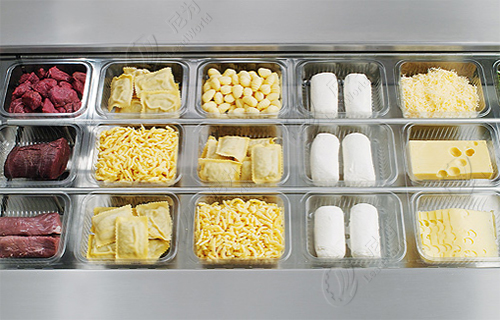 3.投料區(qū)。拉伸膜被拉伸成型之后,運行到投料區(qū)。填裝物料時,企業(yè)可自行選擇人工裝填或機械填裝。椰棗、奶酪、果脯等顆粒固形物可選配容器式計量灌裝機灌裝,番茄醬、黃油等膏狀、液體可選配液體罐裝機進(jìn)行灌裝等。
